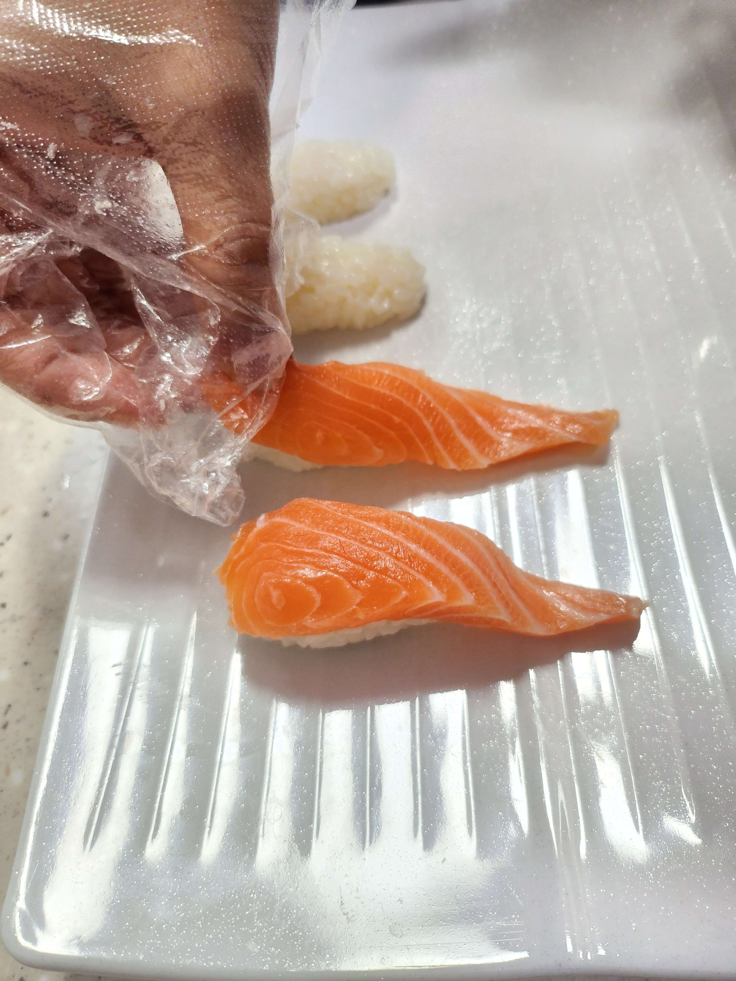 연어초밥 만드는 법은 정말 쉽습니다. 길게 썬 연어회를 밥 위에 얹으면 끝이죠.
