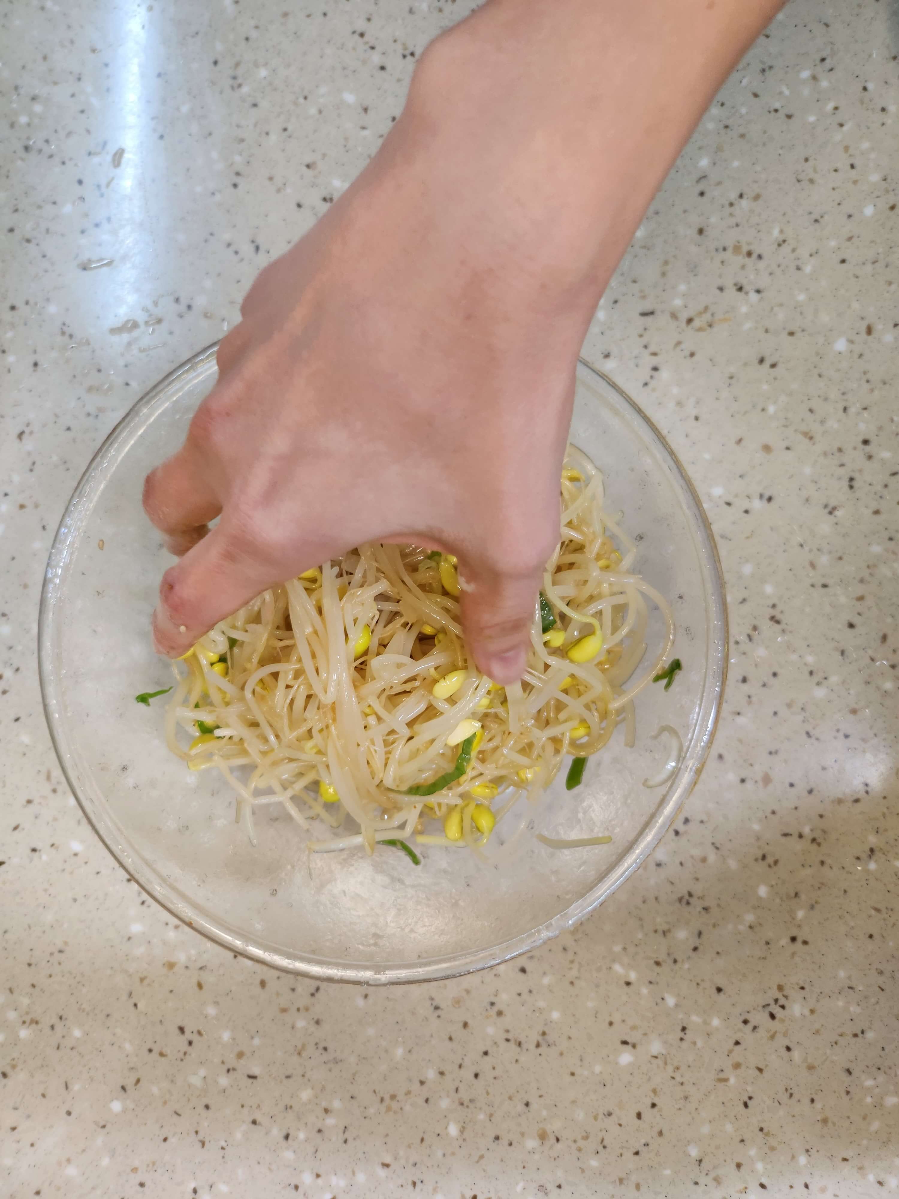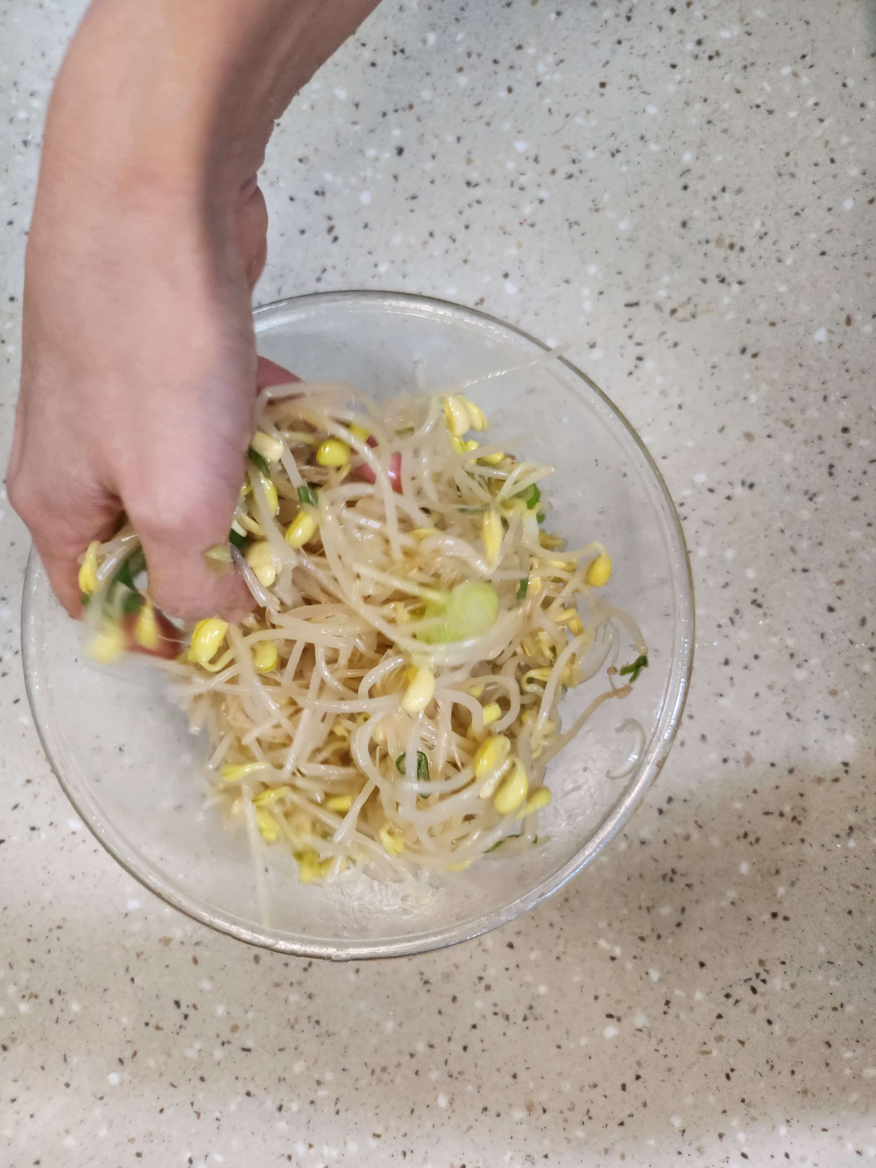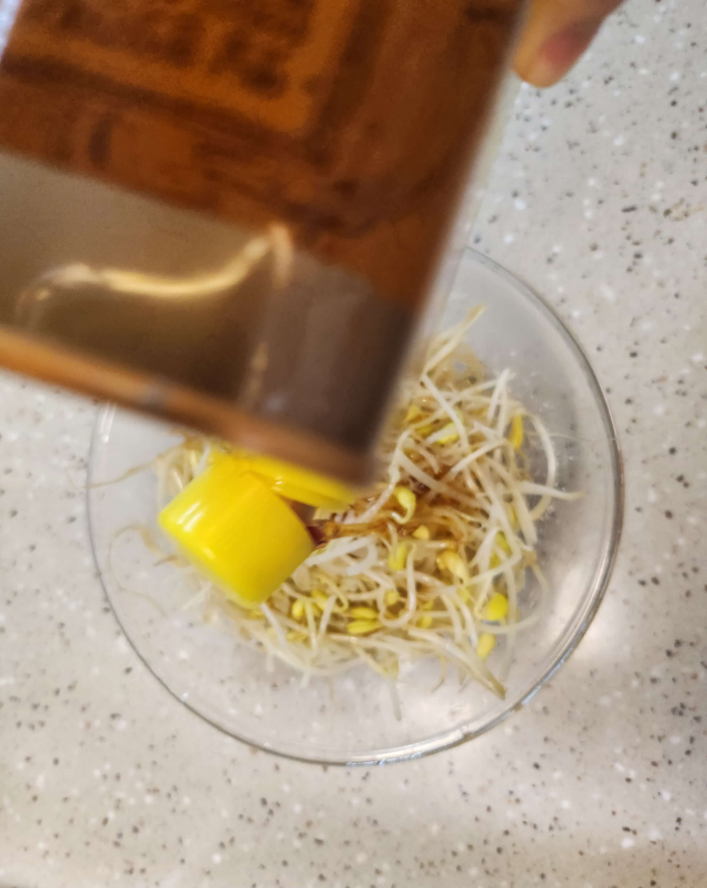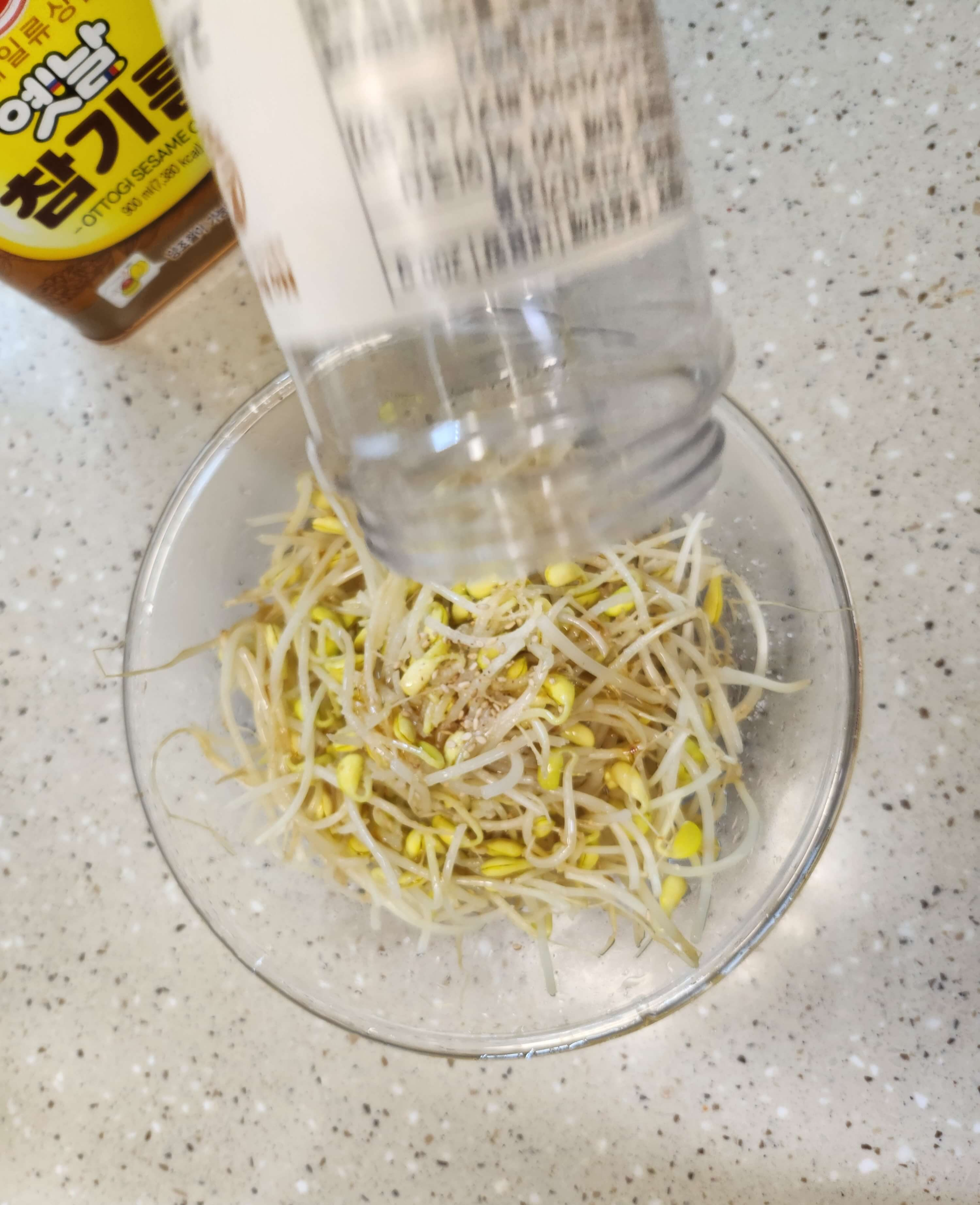 ④ 잘 익은 콩나물에 소금 1/2스푼, 참치액 1/2스푼, 참기름 2스푼을 넣어 조물거려 줍니다.