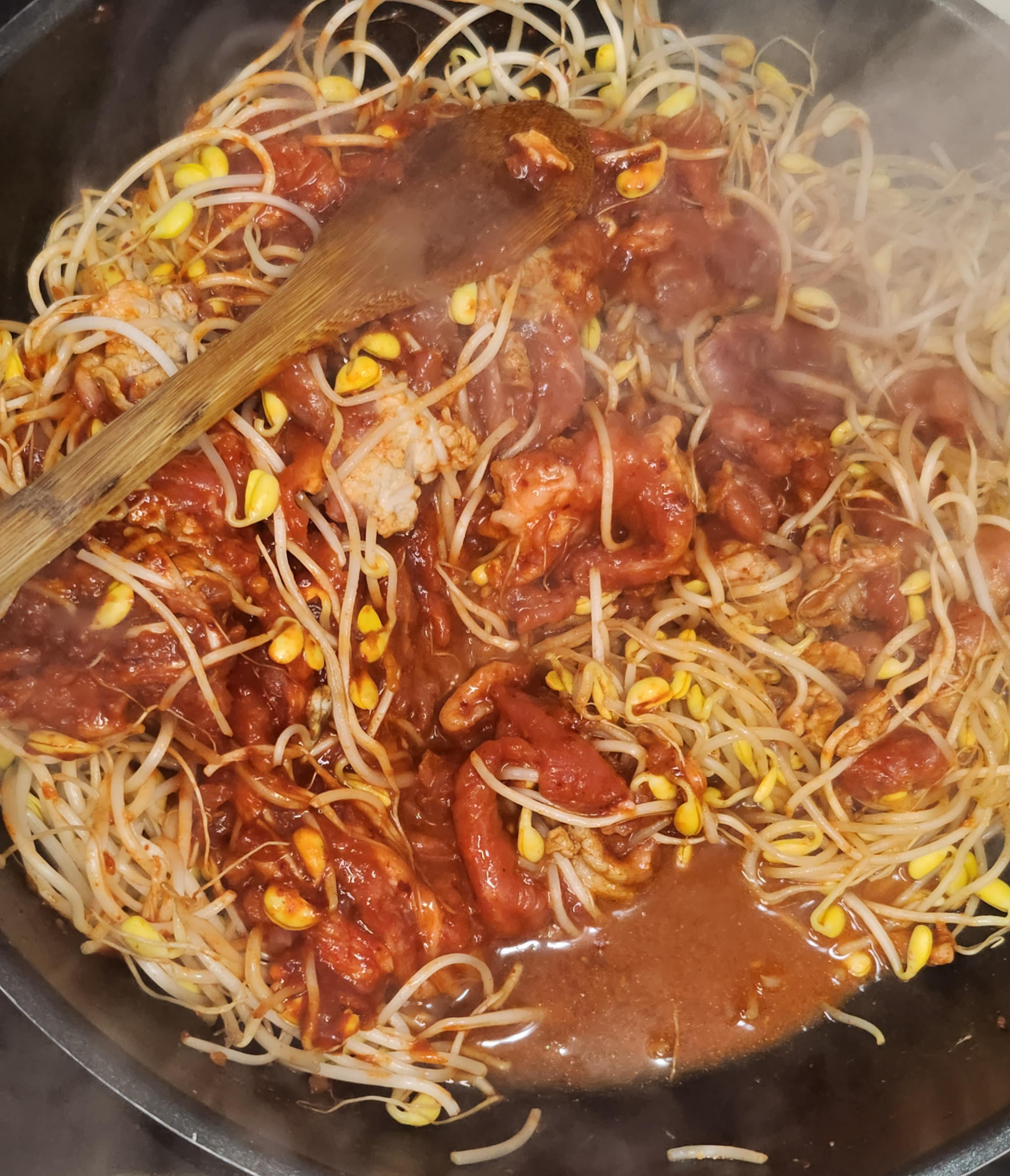 ⑤ 중강불로 10분 정도 볶아주면 고기가 완전히 익고 콩나물 숨이 죽습니다. 그러면 완성!