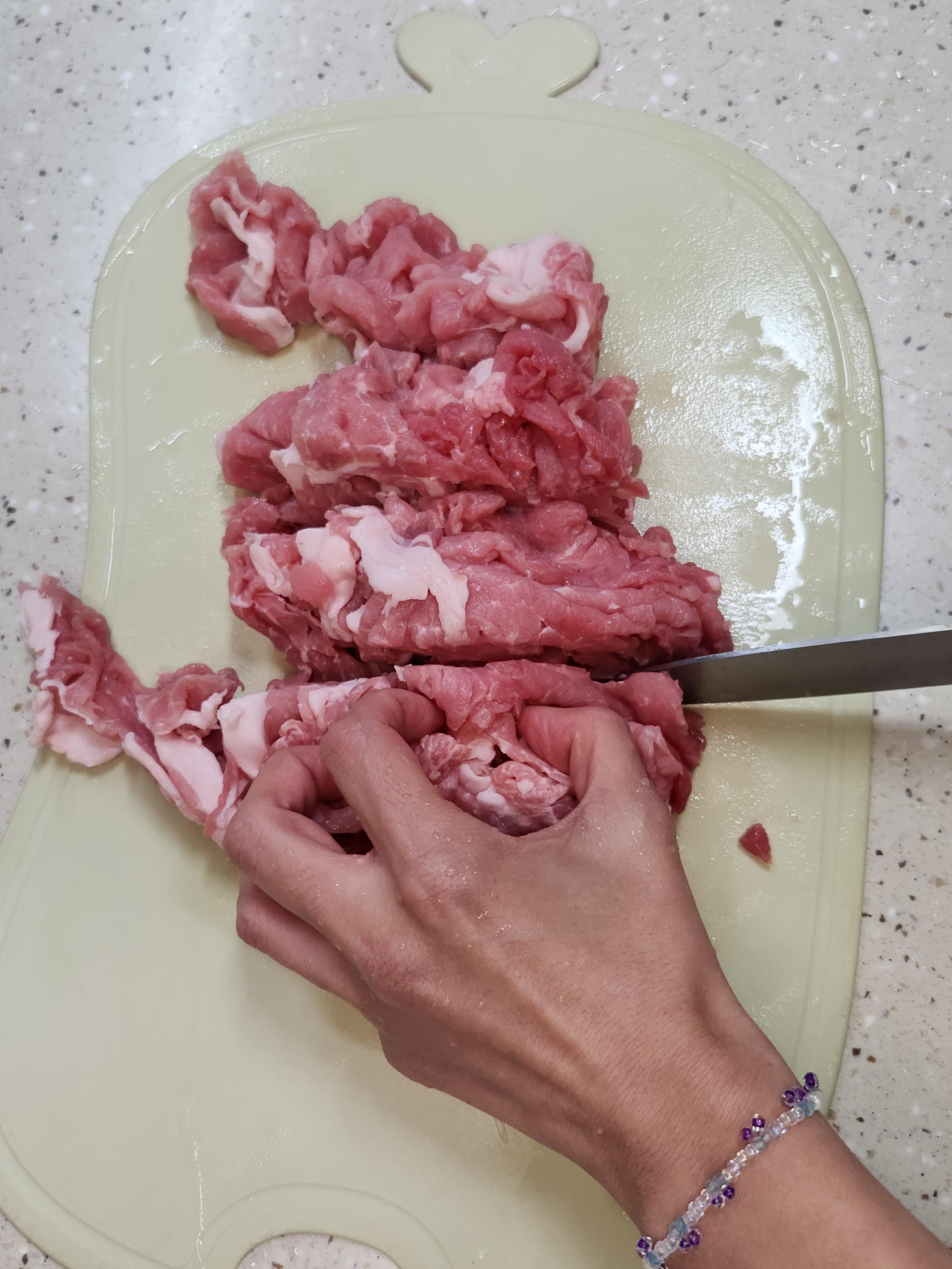 ② 준비된 고기를 먹기 좋은 크기로 썰어주고 콩나물 위에 올려줍니다.