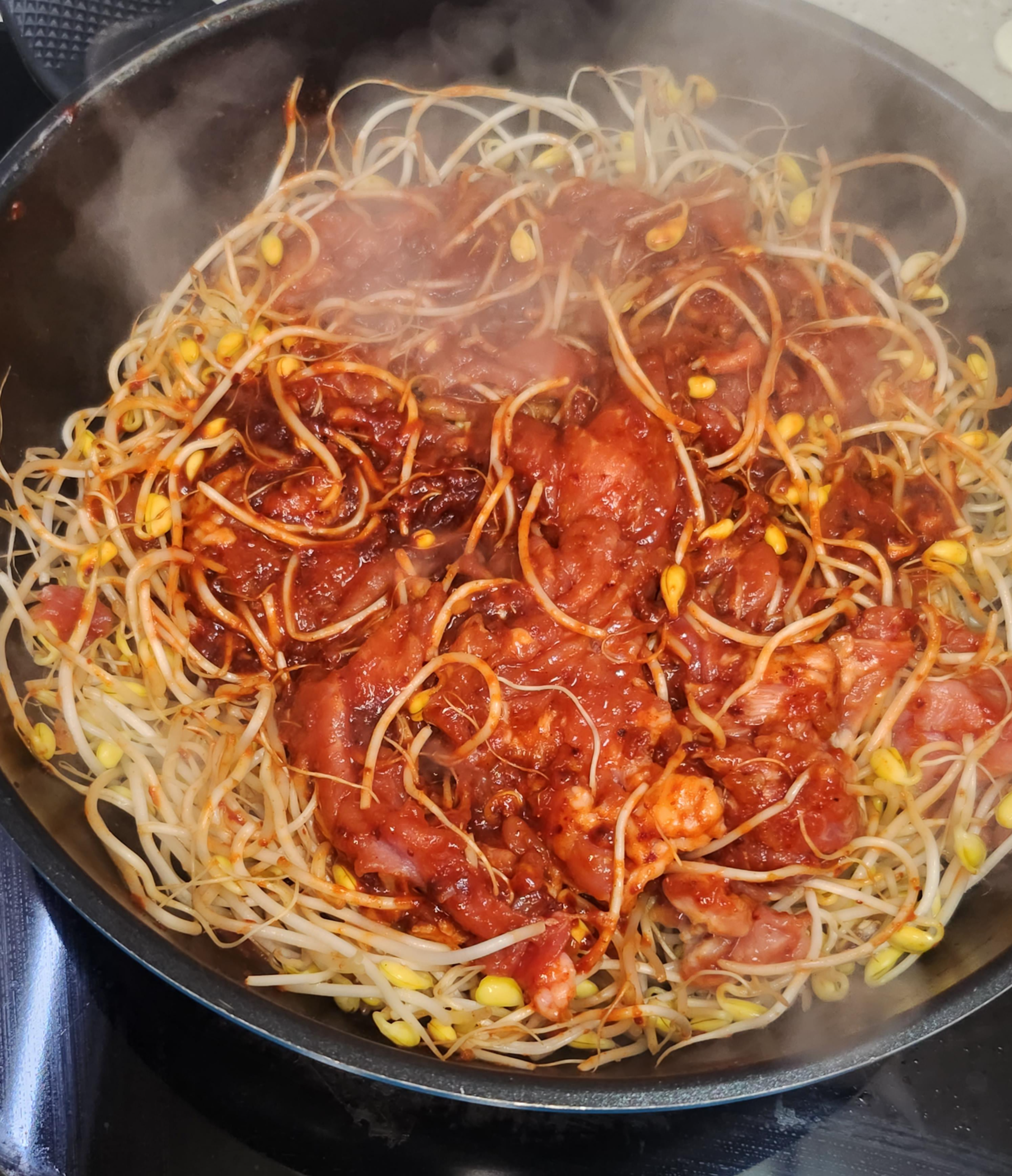 보통 고기 1근과 콩나물 1 봉지 비율로 조리하지만 저는 콩나물을 좋아하기도 하고 콩나물은 숨이 죽으면 양이 너무 적어져서 2봉으로 조리했습니다. 콩나물이 많으면 식감도 좋고 밥 비벼 먹을 때 더 맛있어요.
