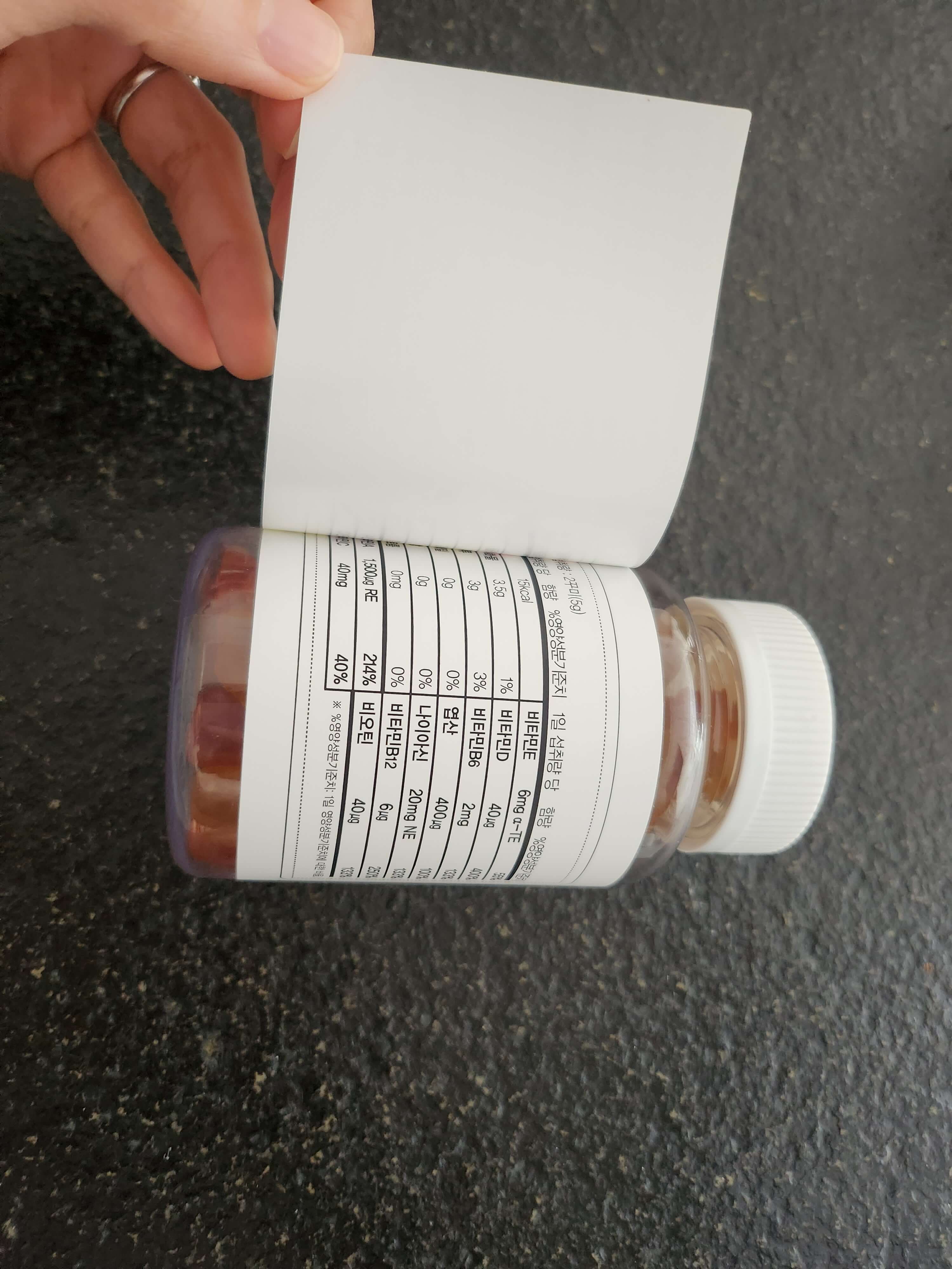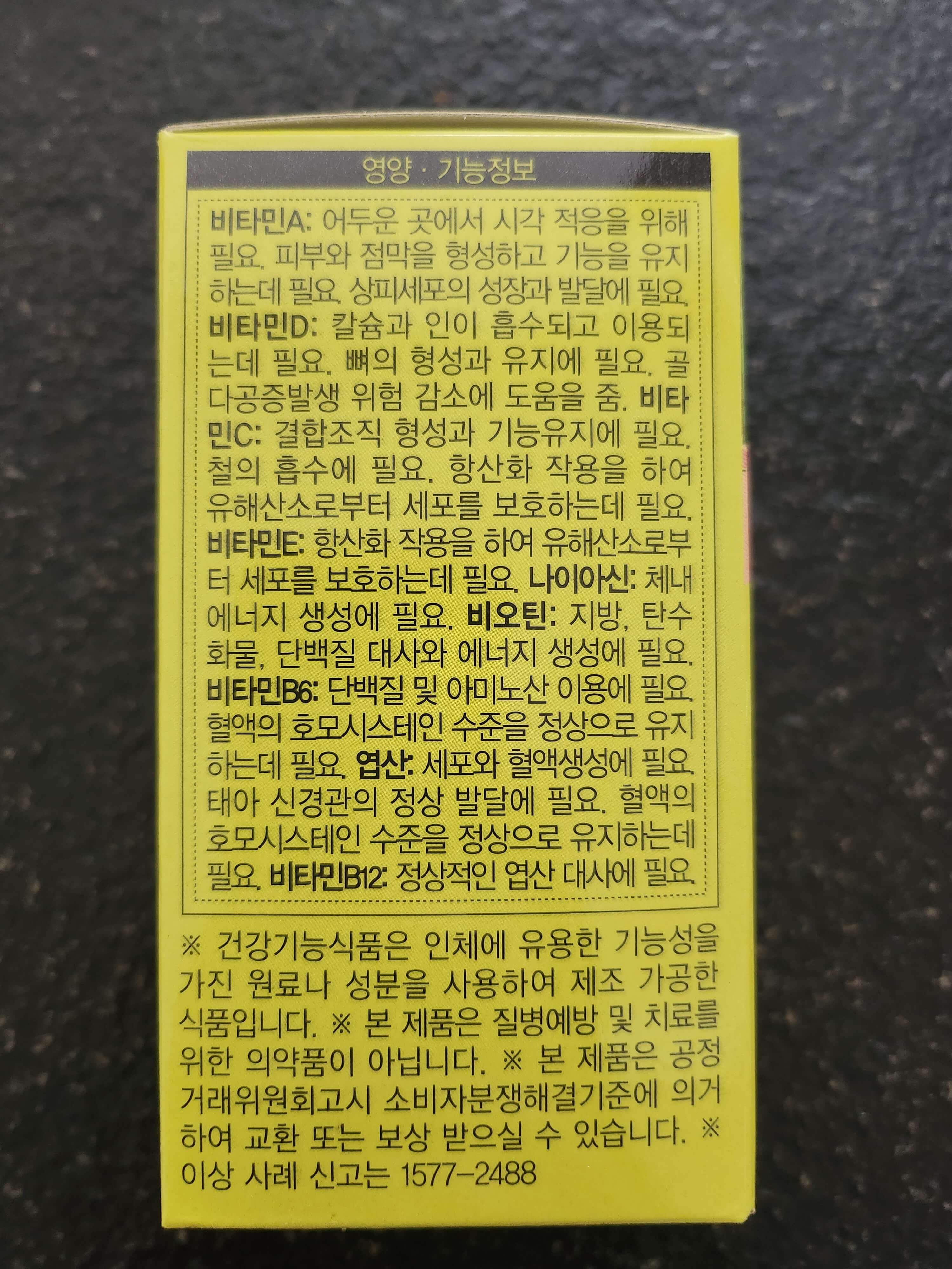 비타민A, 비타민C, 비타민E, 비타민D, 비타민B6, 비타민B12 골고루 들어있고 엽산, 나이아신, 비오틴도 하루 영양성분 기준치 이상으로 들어있으니 1회 이상만 먹어도 좋겠지... 라고 생각하며 복용 중입니다. 효과는 잘 모르겠지만 있겠거니 하는 마음으로 먹는 게 원래 비타민 아닌가요? ㅋㅋ