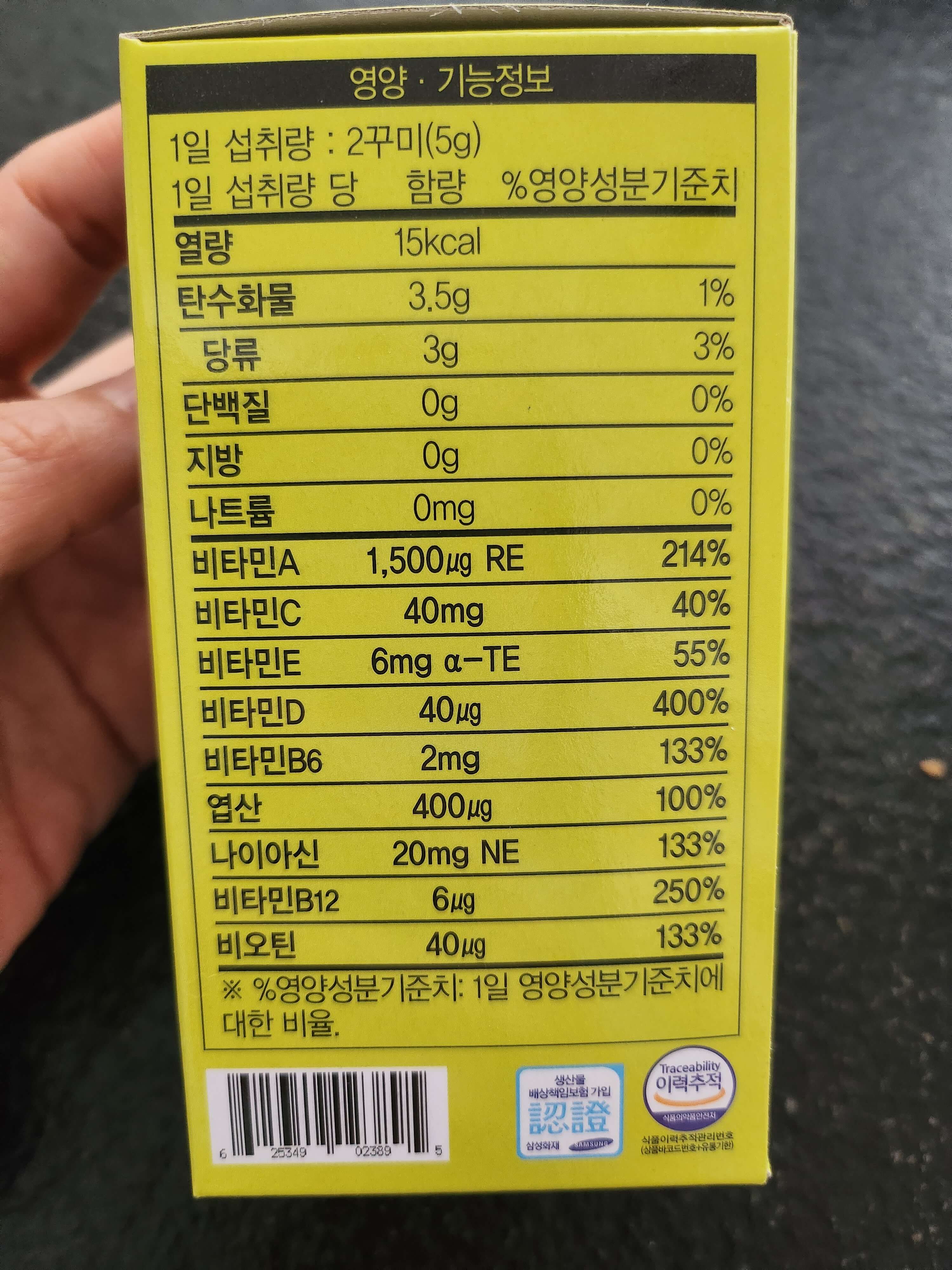 영양성분기준치를 보면 상당히 퍼센테이지가 높은 걸 알 수 있습니다. 달콤하고 맛있게 영양을 챙길 수 있군요.