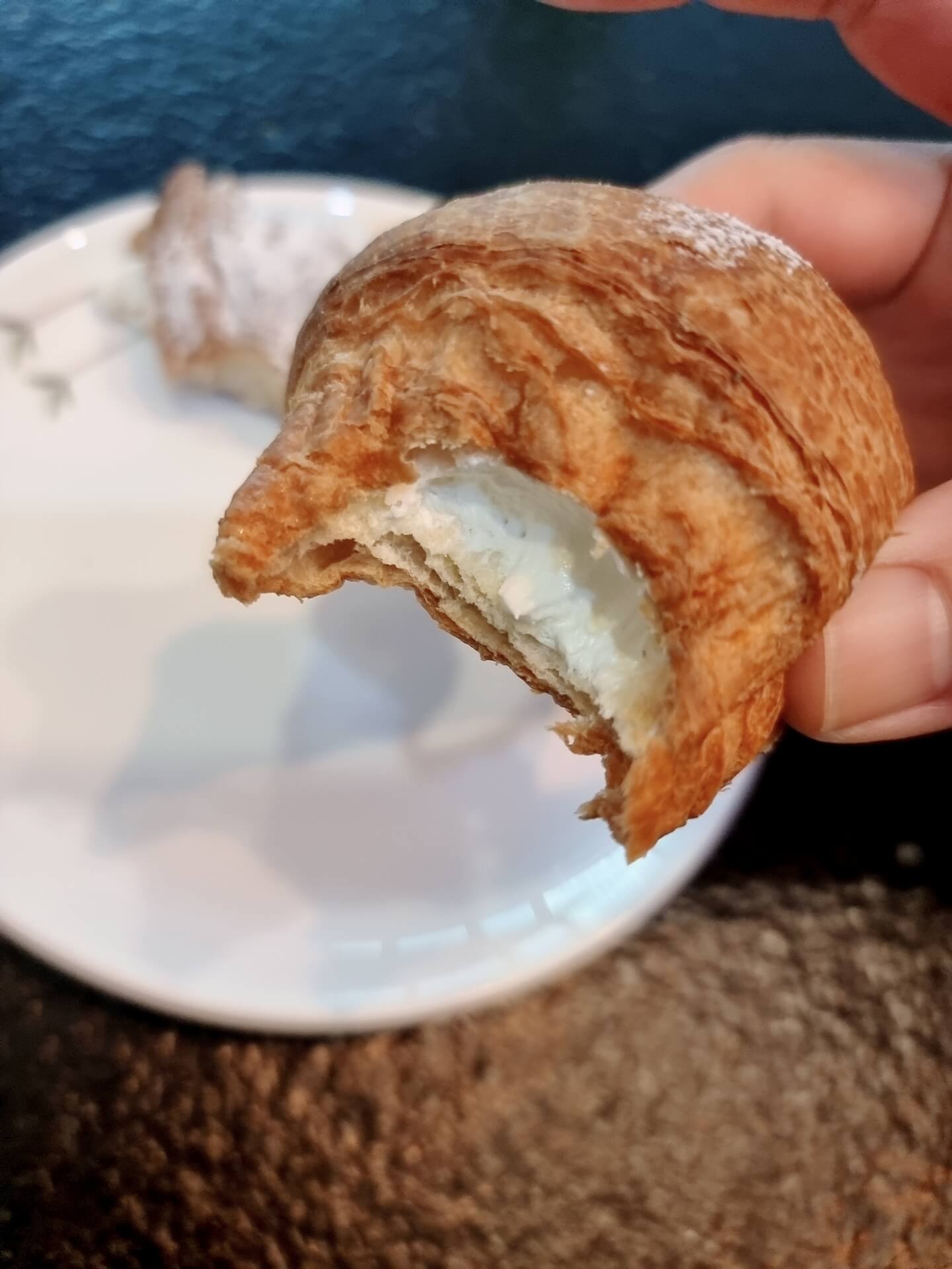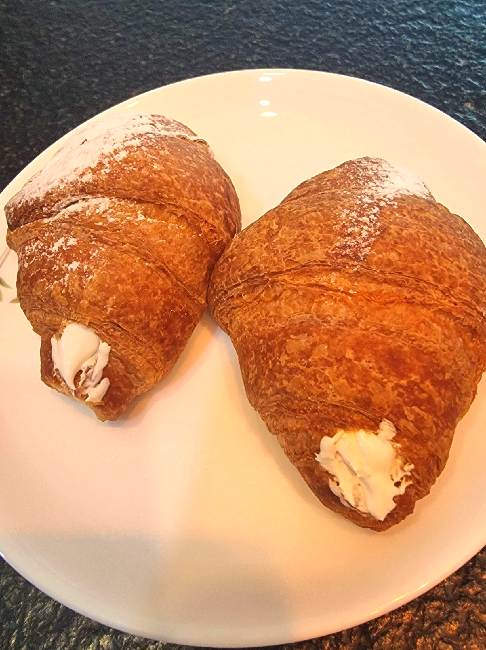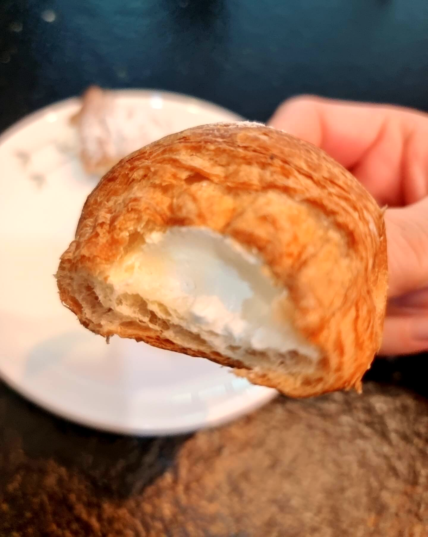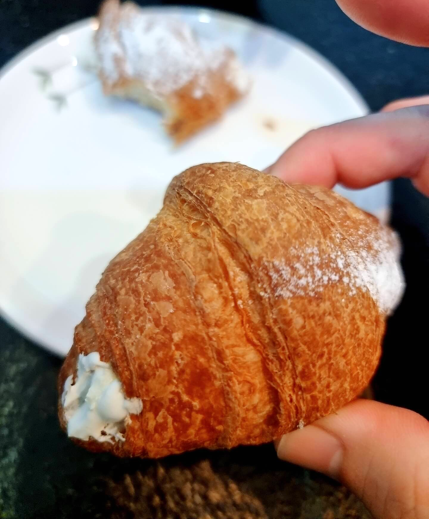 크루아상 안에 달콤하고 부드러운 크림이 듬뿍들어 있습니다. 크로아상을 먹다보면 크리이 너무 많아 흘릴 수 있으니 먹을때 조심해서 드셔야합니다.
