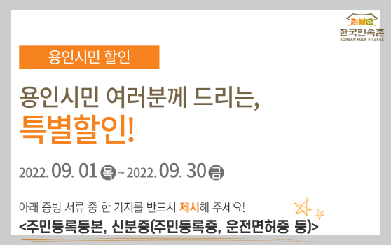 용인시민 특별할인으로 할인가격 동반 1인 동일혜택으로 21,000원 이용이 가능합니다. 이용시 신분증 확인 꼭 필요합니다. 용인시민 할인도 변경될 수 있으니 꼭 민속촌 홈페이지 이달의 할인에서 확인하시기 바랍니다.
