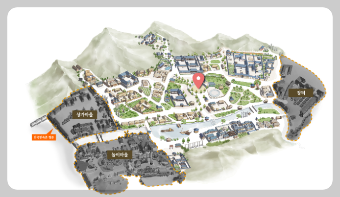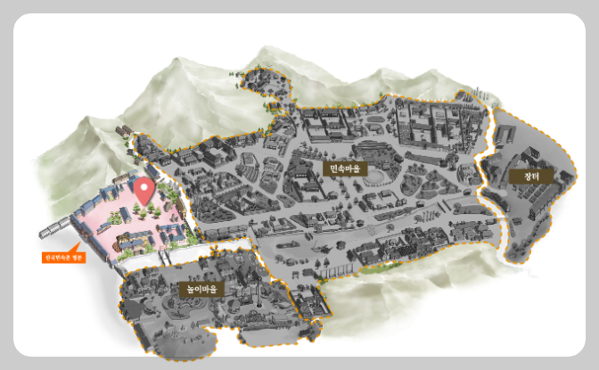 한국민속촌은 1974년 건립된 전통문화 테마 종합관광지로 조선시대 마을 실물 가옥을 복원해 만든 테마파크로 사계절 변화에 따른 생활문화를 재현하고 있습니다. 야외에서는 체험현 전시와 전통방식을 계승한 생활공예, 절기별 세시풍속을 활동을 직접 보면서 전통문화유산 가치를 느낄 수 있는 공간입니다.