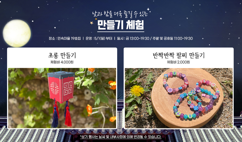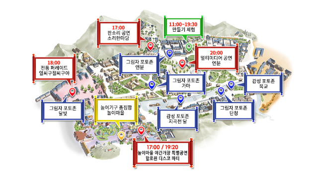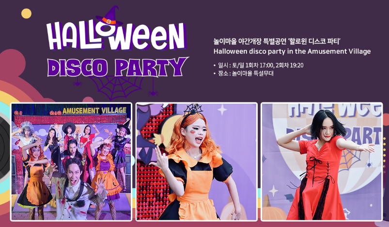 야간개장 행사는 민속촌 내부 곳곳에서 진행됩니다. 만들기 체험, 할로윈 디스코 파티 까지 즐겁게 즐기시기 바랍니다.