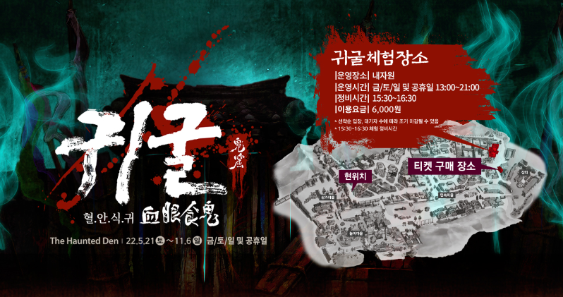 또한 공포 체험으로 귀굴 체험도 진행하고 있습니다. 별도 이용요금 6천원이 있으며 운영시간을 금/토/일/공휴일 13:00 ~ 21:00입니다. (귀굴체험 22.5.21 ~11.6 까지 운영)