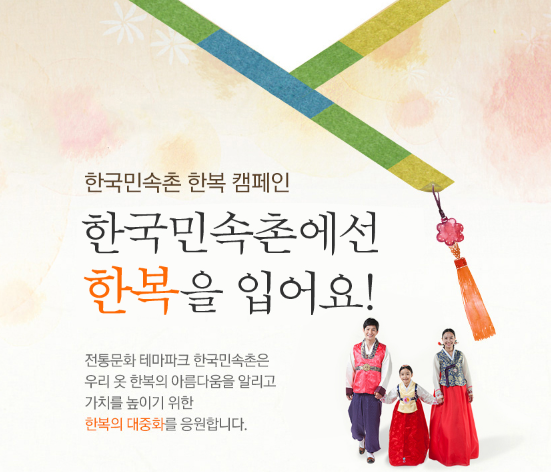 한국민속촌에 한복을 입고 오시는 모든 분들에게 할인을 적용해 21,000원에 민속촌을 이용할 수 있습니다.