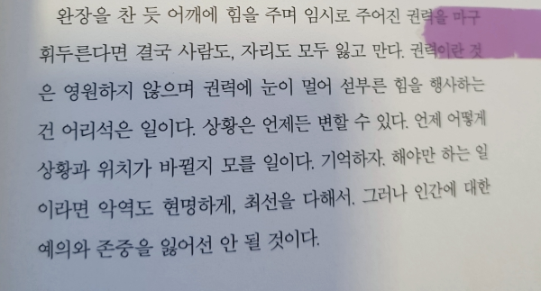 영원한 부도 권력도 언젠가는 끝이 있기 마련이다. 내가 휘두르는 부와 권력의 끝에 다치는 사람이 있는지 살펴볼 필요가 있다. 인간의 대한 예의와 존중보다 앞설 것은 세상에 아무것도 없기 때문이다.