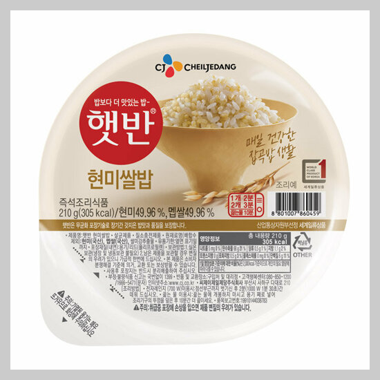 210g, 305kcal, 현미쌀밥 햇반 원재료 함량은 현미 50%, 멥쌀 49.92% 제품입니다. 유통기한은 제조일로 부터 9개월입니다.