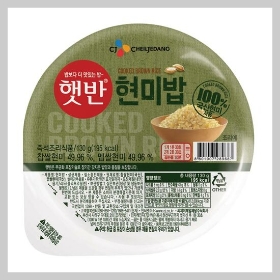 130g, 195kcal, 100%현미밥 햇반 원재료 함량은 찹쌀현미 49.96%, 멥쌀현미 49.96% 제품입니다. 유통기한은 제조일로 부터 9개월입니다.