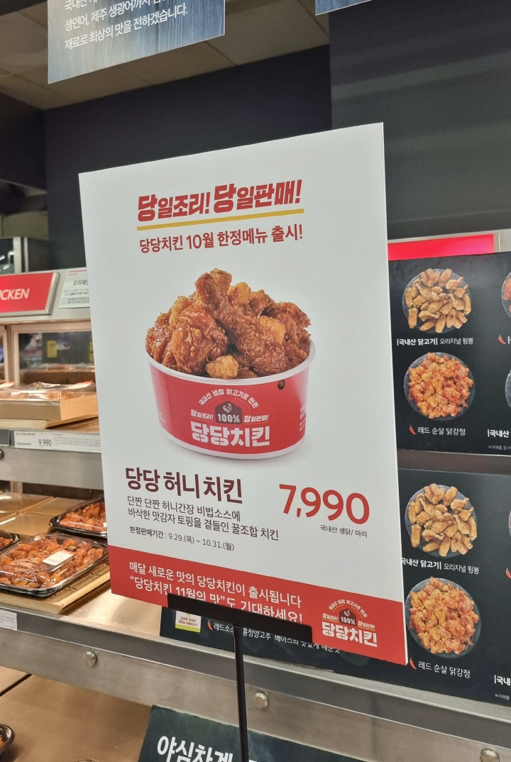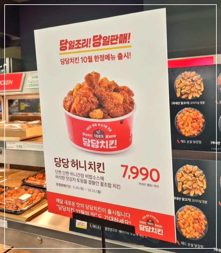 다음에 홈플러스 가면 10월 한정메뉴 당당 허니치킨에 도전해 보겠습니다. 11월에는 다른 맛이 나온다고 하니 10월에 꼭 당당 허니치킨 성공해보시기 바랍니다. 감사합니다.