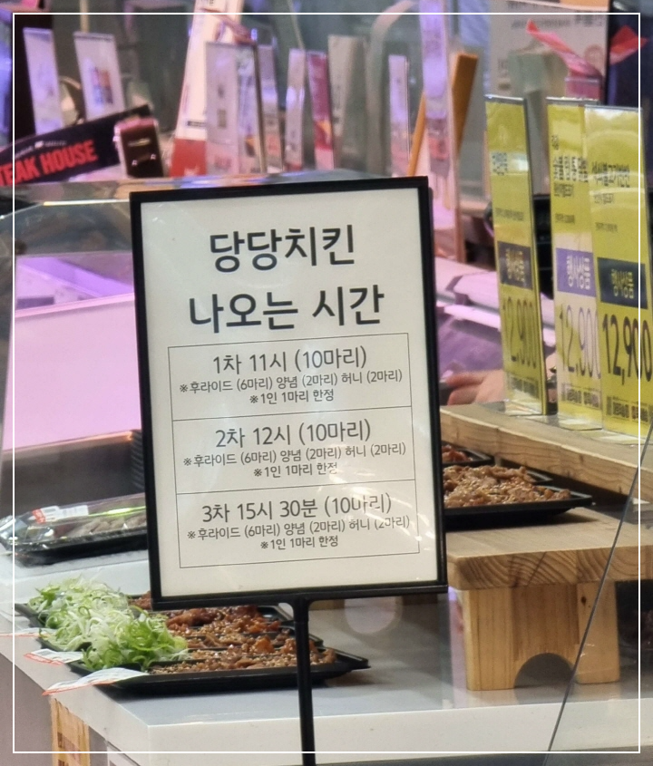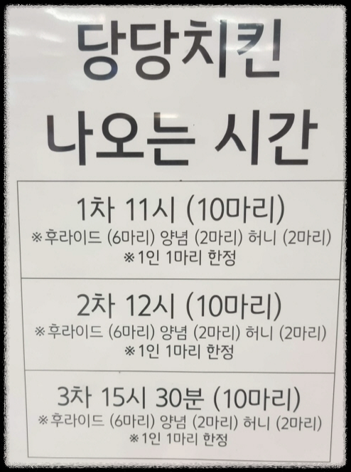 당당치킨 오프라인 매장 기준으로 판매 시간을 알려드리면, 지점별로 차이가 있고 제가 구입한 곳은 홈플러스 화성동탄점으로 총 3차 판매를 진행하고 있습니다. (1인 1마리 한정입니다.)