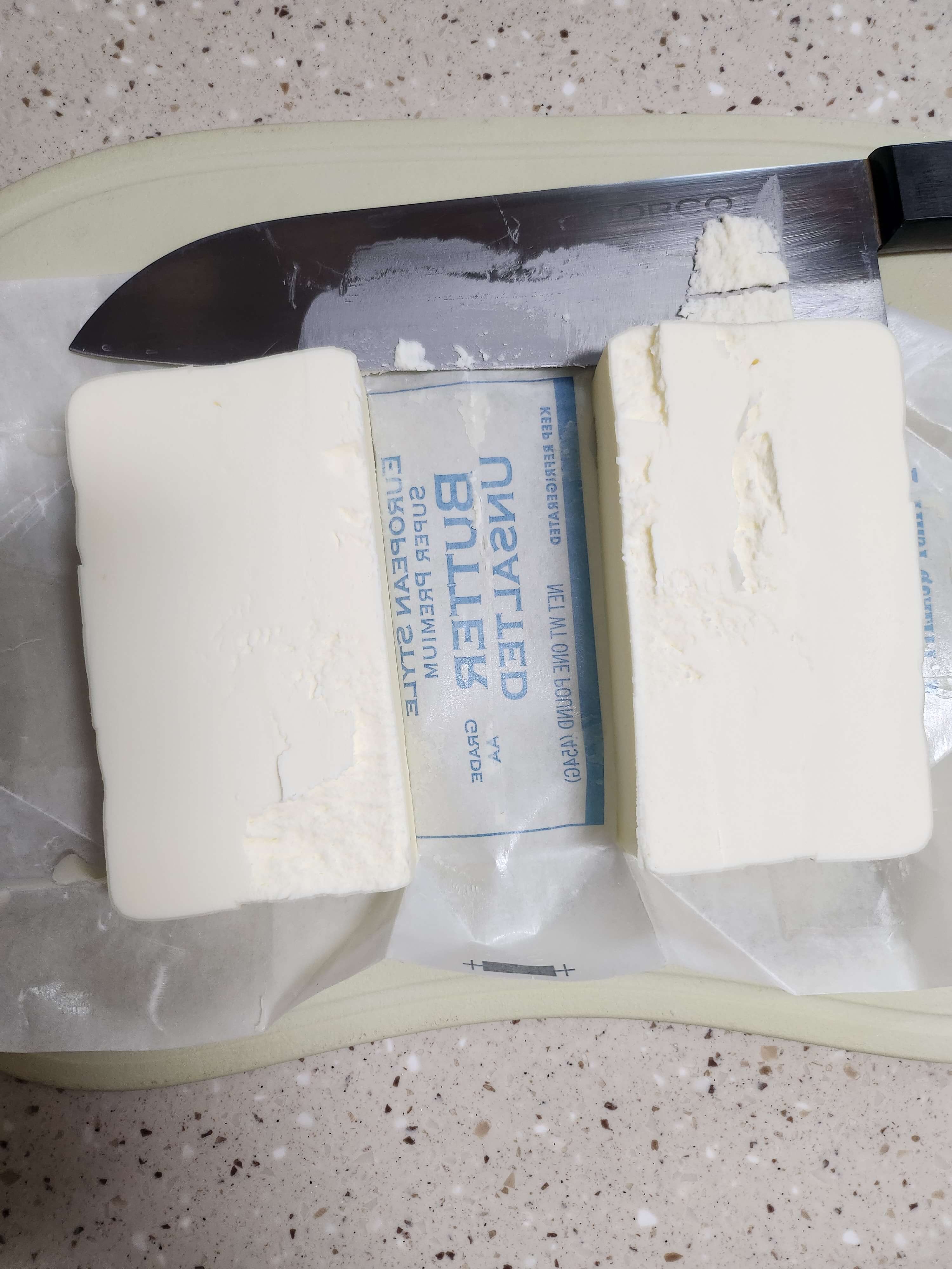한 덩이의 버터가 두 개로 갈라지고, 2개의 버터는 4개로, 4개에서 16개로 깍둑썰기 해줍니다.