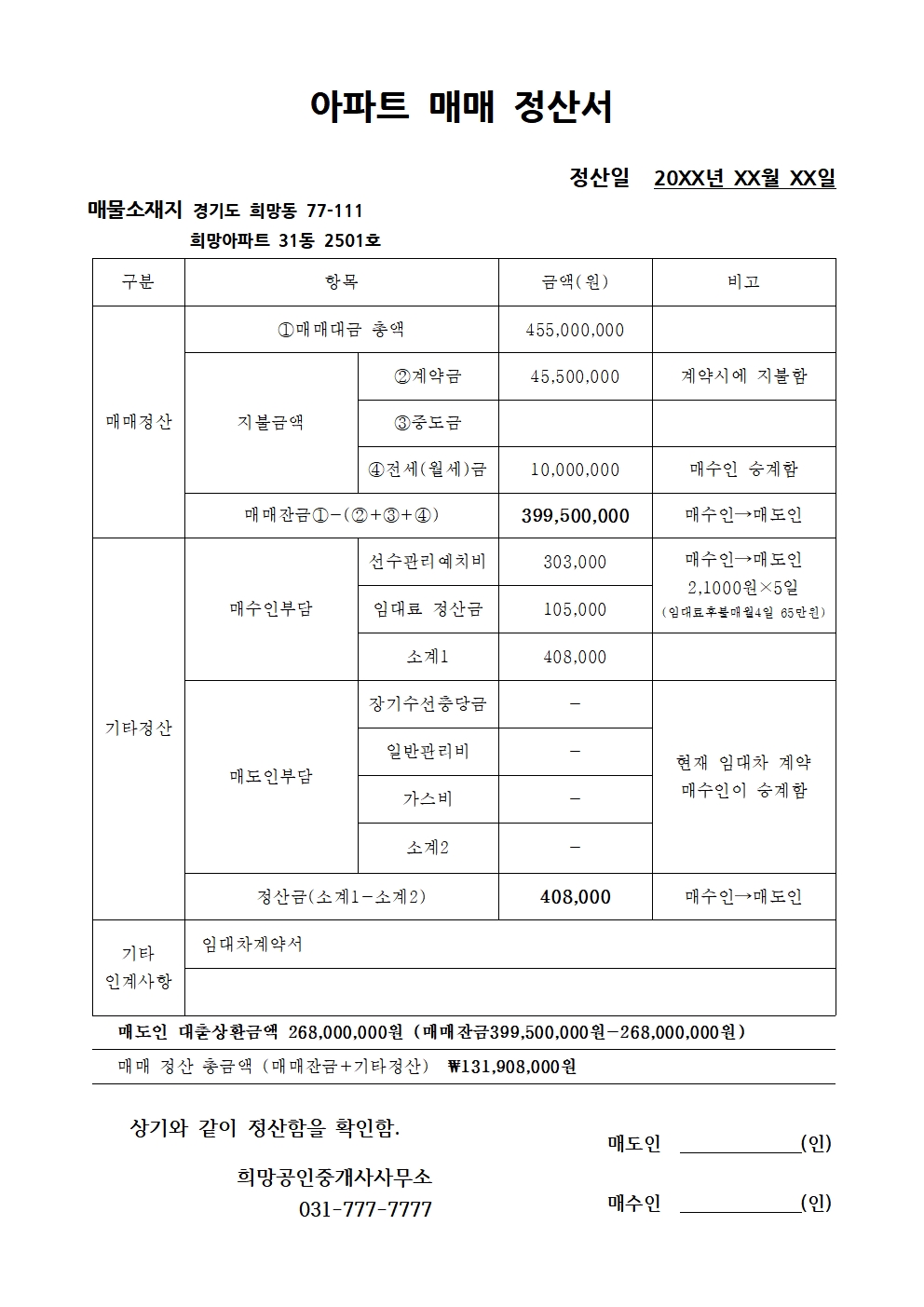 이 경우 위에 파일을 다운받아 매매 정산서를 작성해 매수인, 매도인에게 설명한다면 쉽게 잔금을 마무리할 수 있을 것입니다.