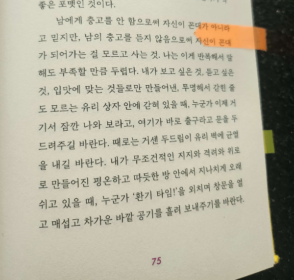 가령 학교에서 부모님에게 확인 받아오라고 하는 그 부모라는 단어는 부모가 없는 아이에게 상처가 될 수도 있는 말이었다. 부모님이나 학부모 대신 "보호자"등의 대체해도 되겠다. 이런 식으로 결정장애, 벙어리장갑등 누군가 외로워지게 하는 단어들의 사용을 깨닫고 자제하는 것, 그 다정한 시선이 참 좋았다.