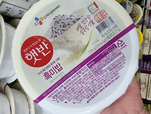 210g, 310kcal, 흑미밥 햇반 원재료 함량은 멥쌀(국산), 찹쌀(국산), 흑미7.7%(국산) 제품입니다. 유통기한은 제조일로 부터 9개월입니다.